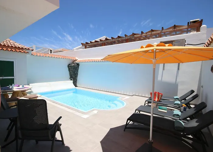 Las Rosas By Rentmedano Stunning Luxury Chocolate Box Villa With Private Heated Pool & Wifi med 6 rum, som ligger inom 10 minuter med bil från La Tejita-stranden, har solarium. Villan med 2 badrum erbjuder möjligheter till vindsurfning, dykning och vandring i området, en promenad från El Médano.